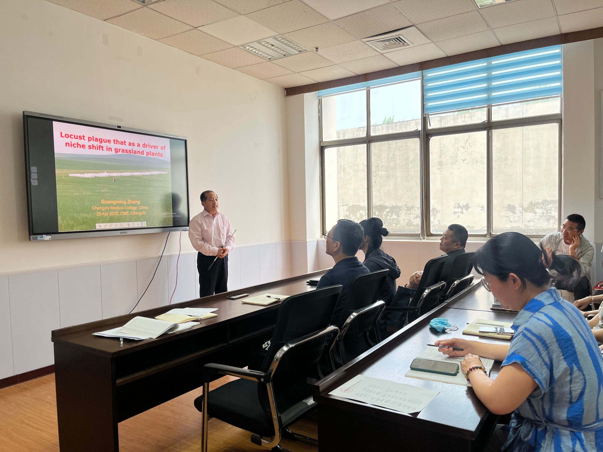 在本期学术报告环节,药学院中药资源与鉴定教研室的张光明博士带来了题为《蝗灾对草原植物 C:N:P 化学计量生态位的影响》的精彩分享。张光明博士聚焦内蒙古锡林郭勒草原生态系统,详细汇报了不同程度蝗灾对常见植物C:N:P 化学计量生态位宽度和重叠的影响研究成果,并深入探讨了这些研究对于草原植物资源合理利用的重要意义。报告引发了在场教师的热烈讨论与深入思考。